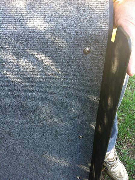 When, after Jasmine’s first neck event, we (read: Jana) wanted a ramp to get our dogs into our mini-bus, we (read: I) built one that was made from a piece of 5//8” plywood with 1.5 x 1.5 x 3/16” thick aluminum angle carriage bolted to the sides. I then covered the plywood with pickup box protective coating for traction.