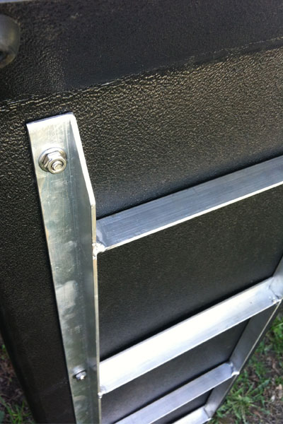 Once again, weight and water resistance were a consideration. So I built a simple frame out of a 1” x 1” x 1/8” aluminum angle. Looking at the pictures, you can see how it was welded together. I then fastened this frame to the existing ramp using ¼” stainless steel carriage bolts.
