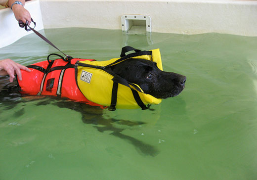 The hydrostatic pressure of the water helps support balance and weak limbs so that a dog can move without falling