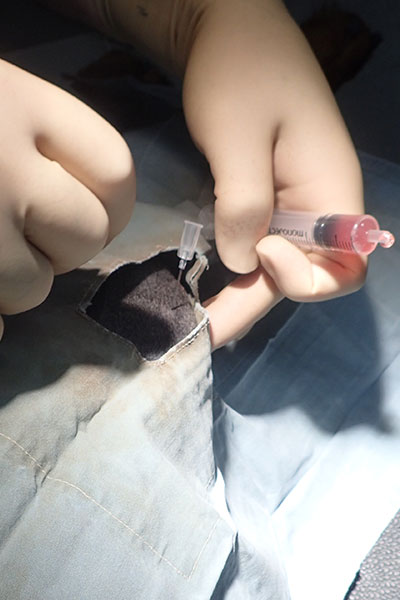 Her blood got drawn and processed. Cookie’s knees were shaved to help prevent infection. Keeping everything sterile is important particularly when injecting inside the joint. Cookie was sedated and he knees injected. Then the sedation was reversed.