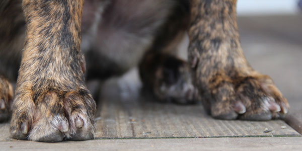 A dog with long toenails can’t stand with legs perpendicular to the ground. Instead, he compensates by adopting the “goat on a rock” stance, where his forelegs are “behind” perpendicular, and the hind legs must come under him to prevent him from tipping forward. (see photo)